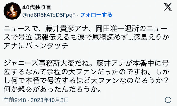 SNSでは、藤井貴彦アナウンサーが岡田准一さんの退所について、なぜ泣くのかという事や、徳島えりかアナの対応に対する好印象な意見も見られました。